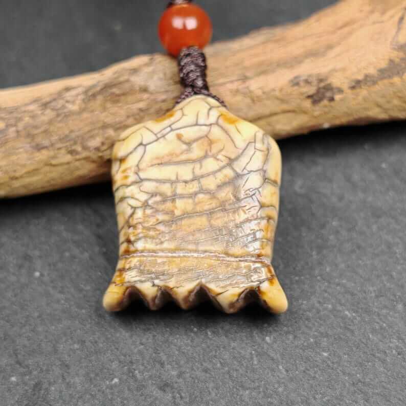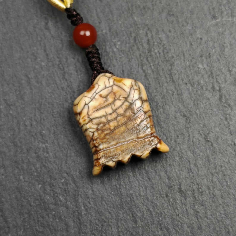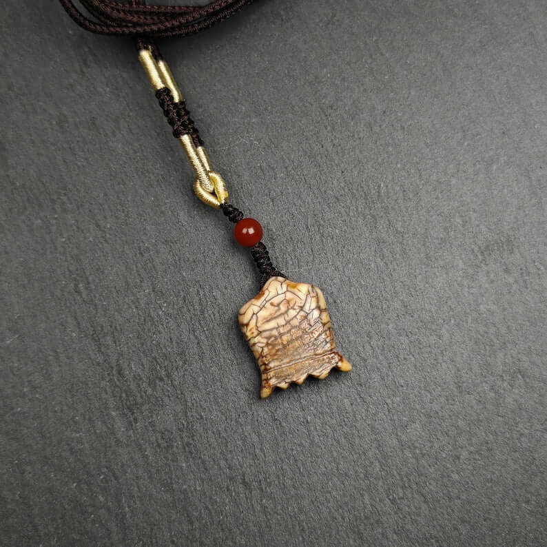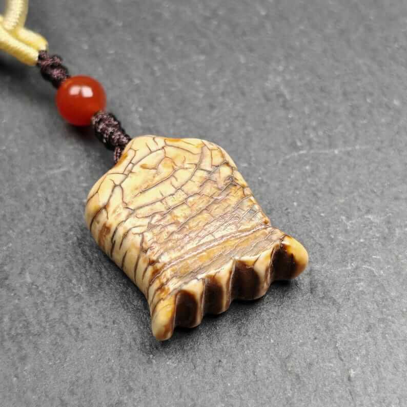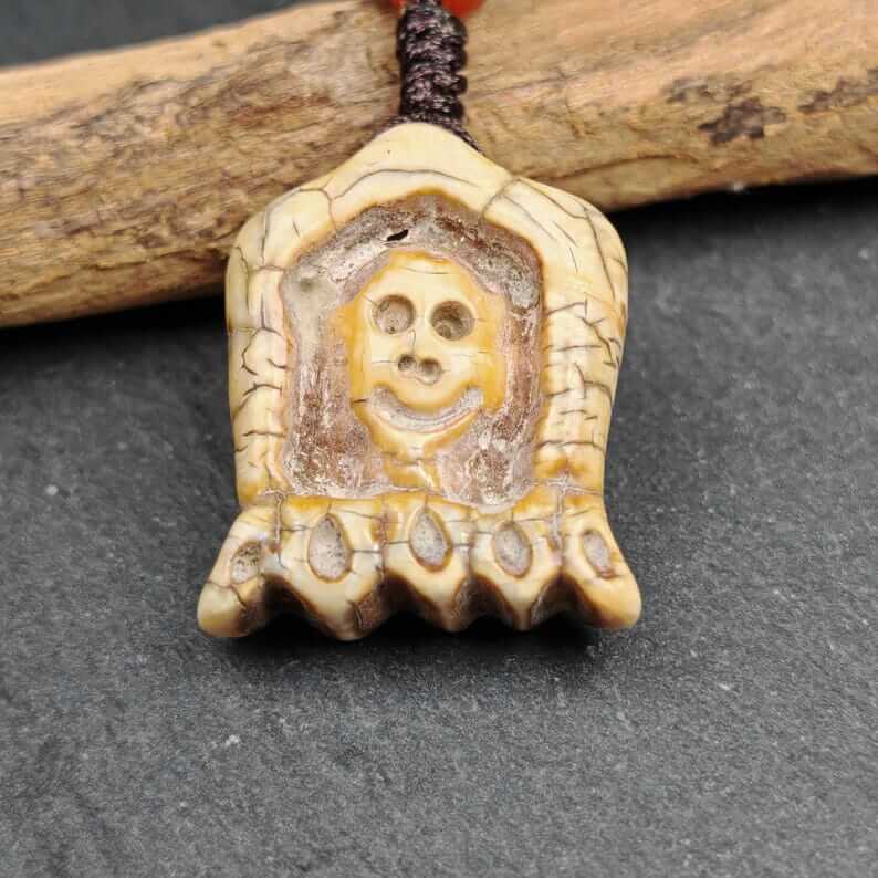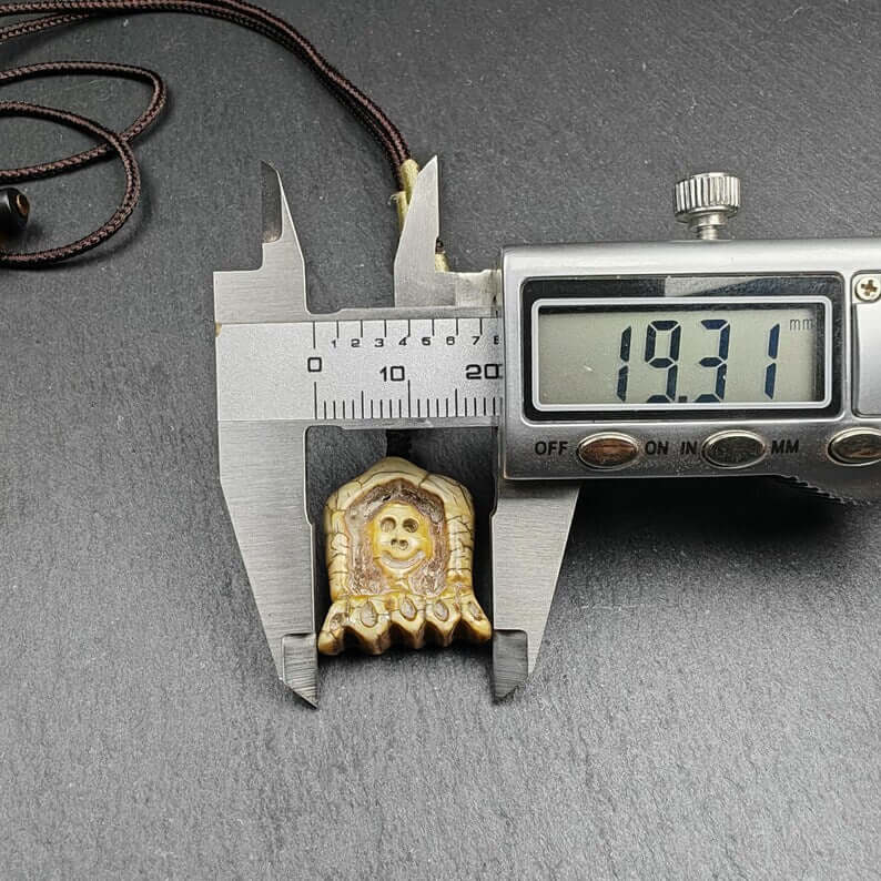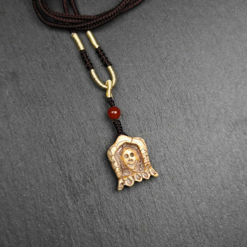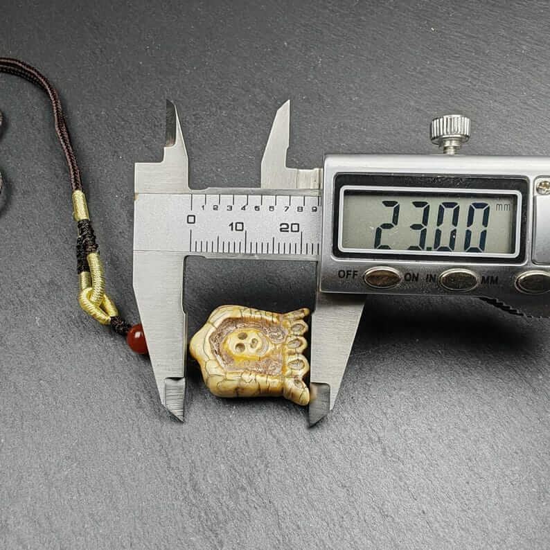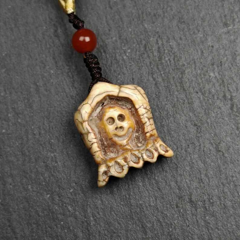 Hand-carved in the 1960s by master Tibetan artisans and consecrated at the revered Yarchen Monastery, this sacred amulet is crafted from old material, featuring the intricate and powerful visage of the Citipati skull. Each detail reflects profound symbolism, blending artistry with spiritual significance.