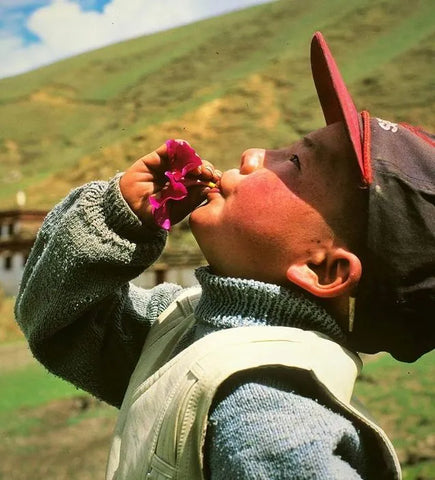 Ein tibetisches Kind hält einen Blumenstrauß, Fotografie von Alessandro Boesi