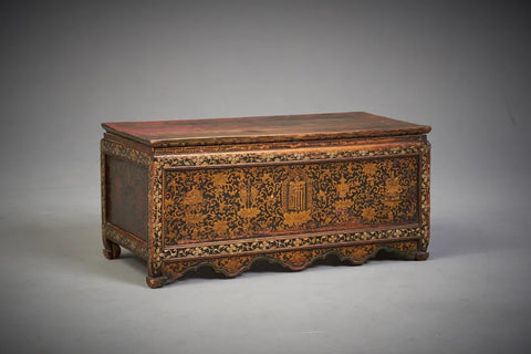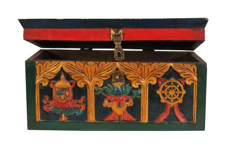 Sorprendentemente, las cajas más exquisitas tienen diversos usos, y las más preciadas suelen utilizarse como "cajas del tesoro". Según las costumbres budistas tibetanas, se utilizan como "tesoros de riqueza" que contienen muchos jarrones con tesoros y objetos consagrados. Se cambian y se realizan rituales y oraciones una vez al año. Estas cajas se utilizan normalmente para guardar objetos consagrados budistas o joyas valiosas, en lugar de pertenencias personales.