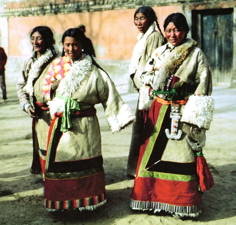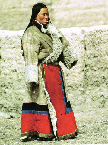 Cuando se usa una túnica tibetana, generalmente se cruza el cuello hacia la derecha y se abrocha con una pretina colorida para ceñir la túnica suelta. Los pliegues de la tela son casuales y naturales, y las túnicas de las mujeres generalmente llegan hasta los tobillos y la pretina se ata más arriba para enfatizar la parte inferior de la falda. Esto crea un aspecto elegante y natural, libre y sin restricciones.