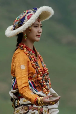 En general, los accesorios tibetanos pueden incluir artículos hechos de oro y plata, así como joyas hechas de coral, turquesa, ámbar, ágata, jade, perlas y más. Las mujeres suelen usar aretes, collares, pulseras y anillos, mientras que los hombres prefieren usar espadas, sombreros y aretes. Esto forma el estilo típico de ropa y accesorios para las personas que viven en la meseta.