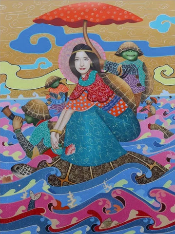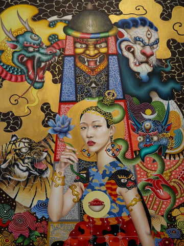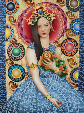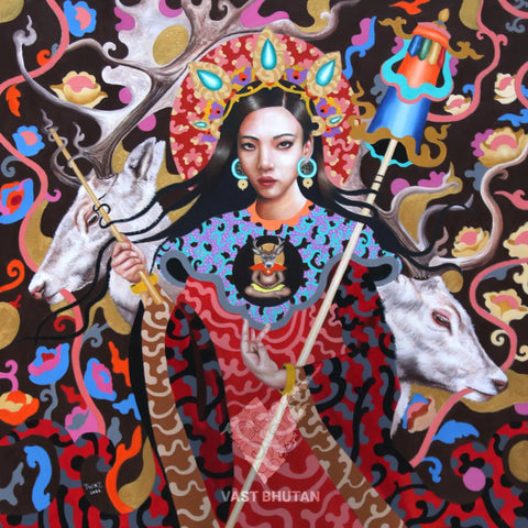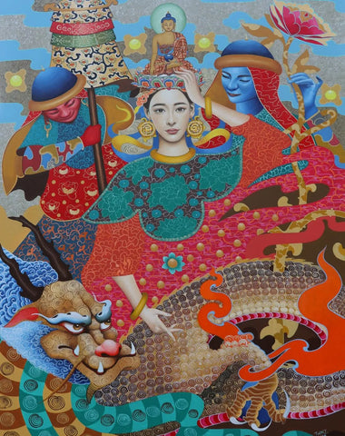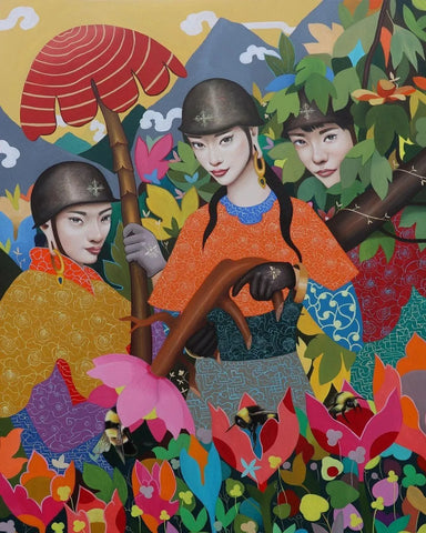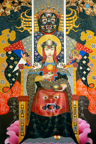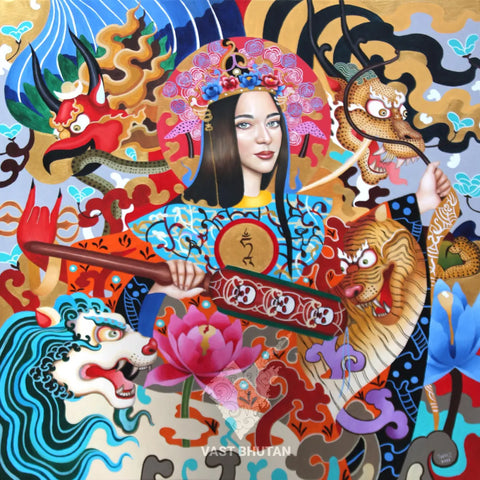 "Warrior Sisters of the Vajra Guardians" is inspired by the Long Life Five Sisters, who are the disciples of the accomplished master Milarepa's Dakini. They have vowed to protect the Buddha Dharma and are widely worshipped in Bhutan and the Himalayan region.