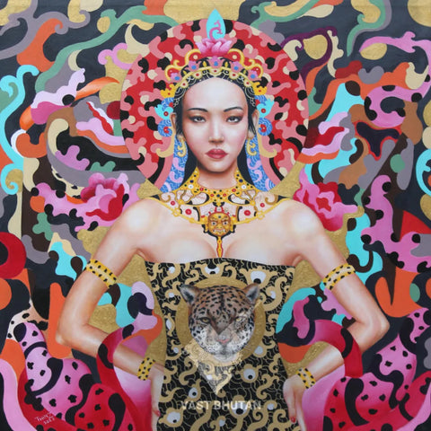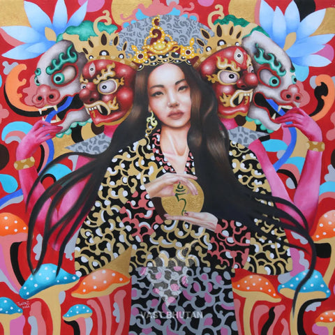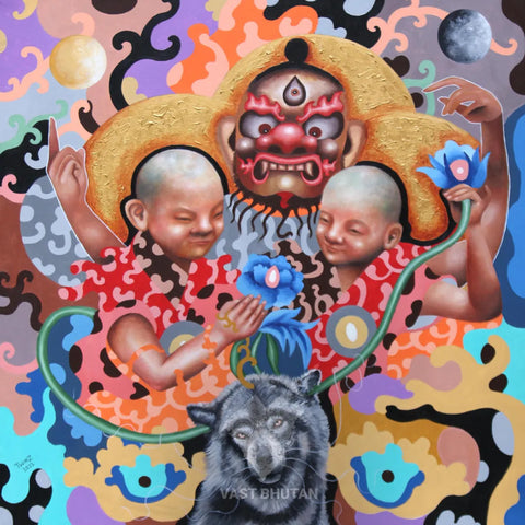 The Twinz draw inspiration from Buddhist traditions, consciousness, psychedelia, warrior spirit, shamanism, material culture of Bhutan (painting, sculpture, temples) and intangible cultural heritage (knowledge, wisdom and skill) as their creative themes. They combine traditional and modern brushstrokes to express their understanding and views on these themes.