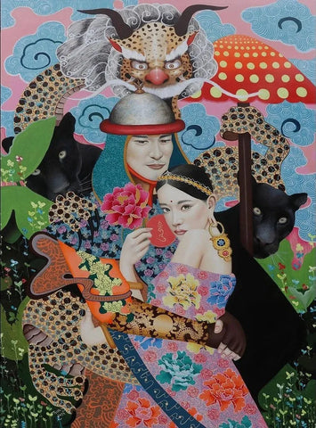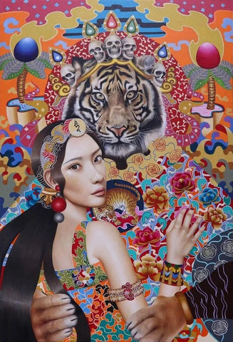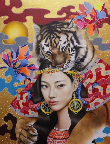 In addition to female portraits, The Twinz have also created a series of paintings based on traditional Tibetan spiritual symbols, blending multiple modern artistic styles, such as "Harmony Four Auspices", "Six Longevity Figures", and the Four Auspicious Animals (Tiger, Lion, Garuda, Dragon).
