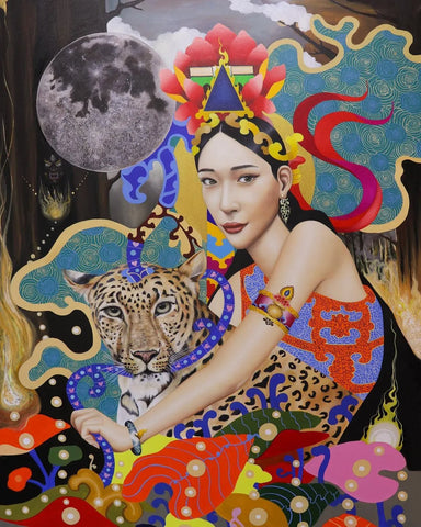 In Buddhism, the jaguar symbolizes the transcendence from ignorance to wisdom. The woman in the picture is a warrior, empowered by the jaguar to fearlessly overcome obstacles in life, confident and clear-minded.