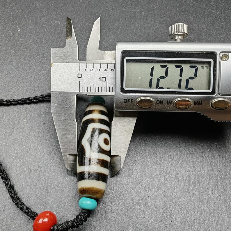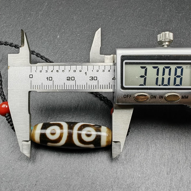 This 3 eyes dzi bead measures about 37 mm x 12 mm( 1.5" x 0.47").