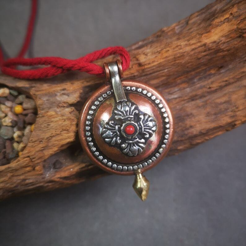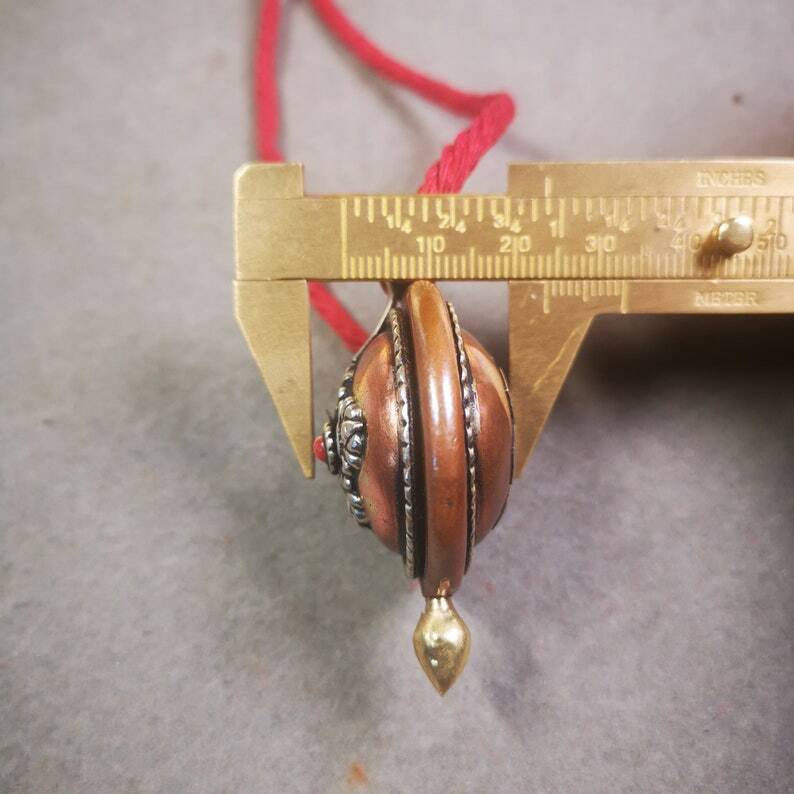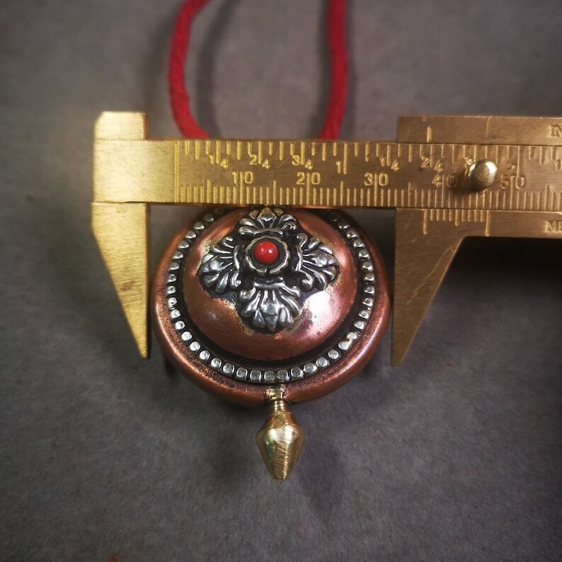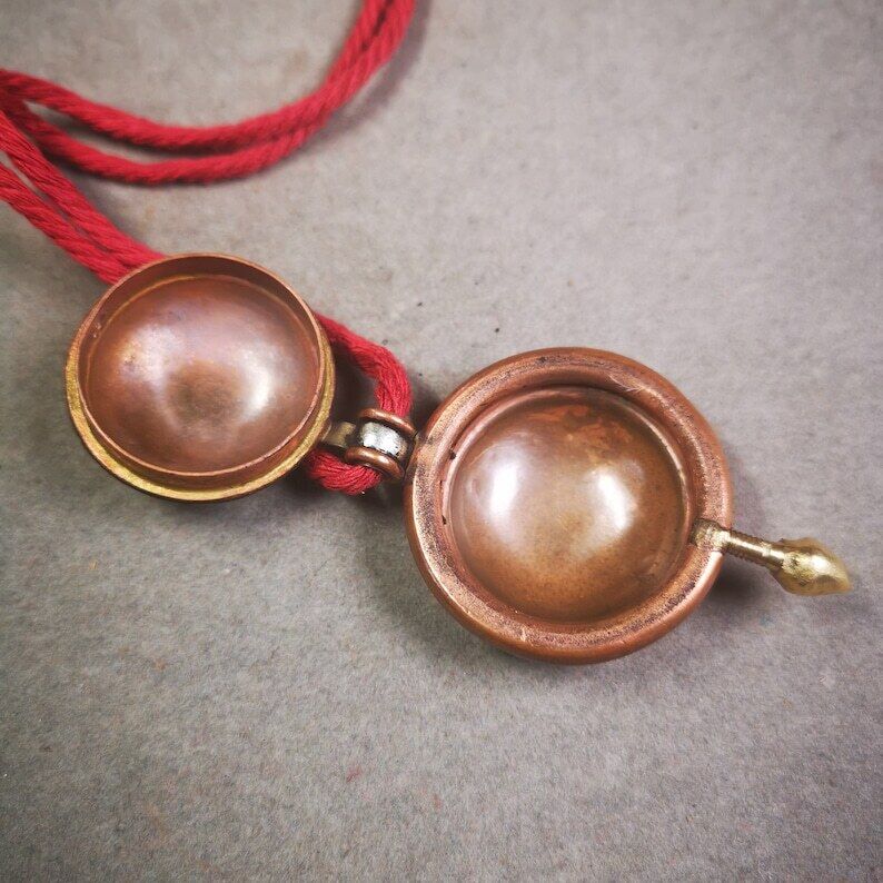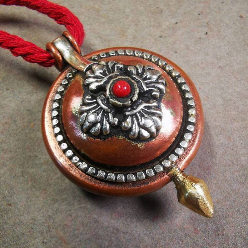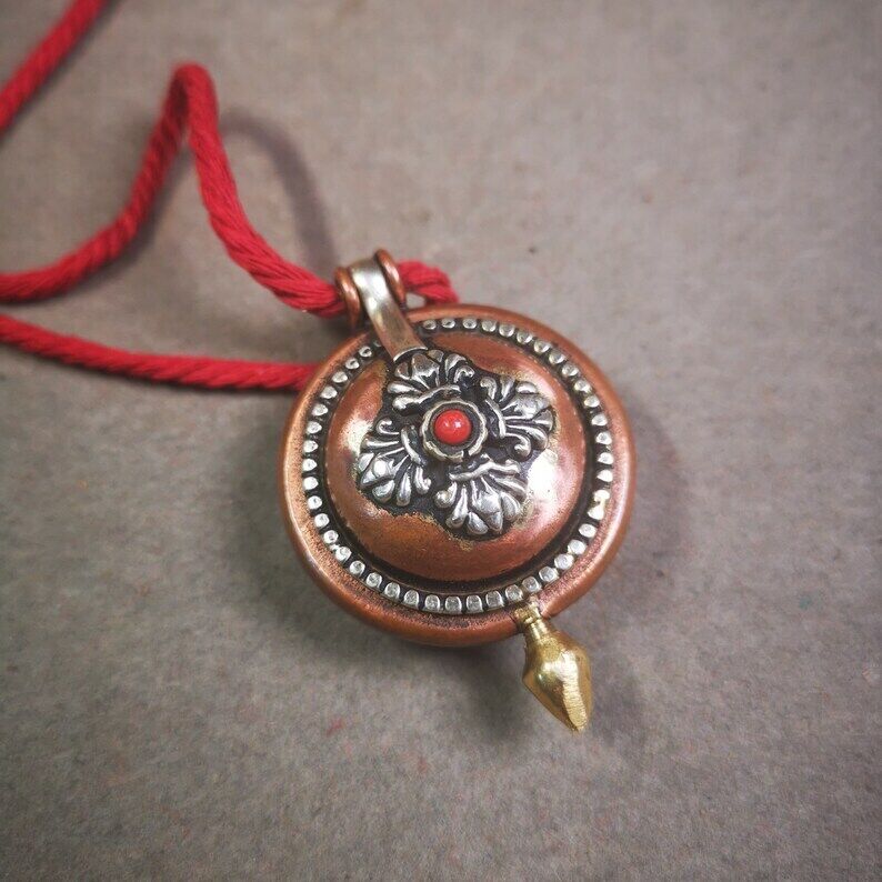A "Gau" or "Ghau" is a Tibetan Buddhist amulet container or prayer box, usually made of metal like silver, brass, copper or gold, and can be worn as jewellery if small enough. They are portable shrines that opens to a concealed inner space, and is traditionally used by Tibetan Buddhists to hold a picture of their favourite diety or Lama, a folded up scroll of sacred mantras, special herbs or sacred relics, and prayer flags.