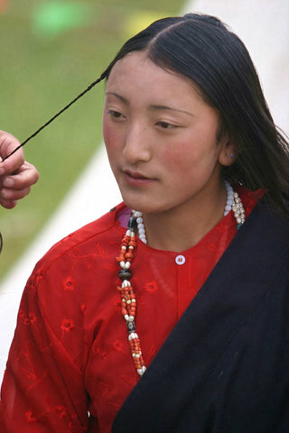 The coming-of-age ceremony is an important ritual for Tibetan women, almost as significant as marriage in their lives. During the preparation for the ceremony, a senior female relative is specially chosen to assist in styling and decorating the young woman's hair.