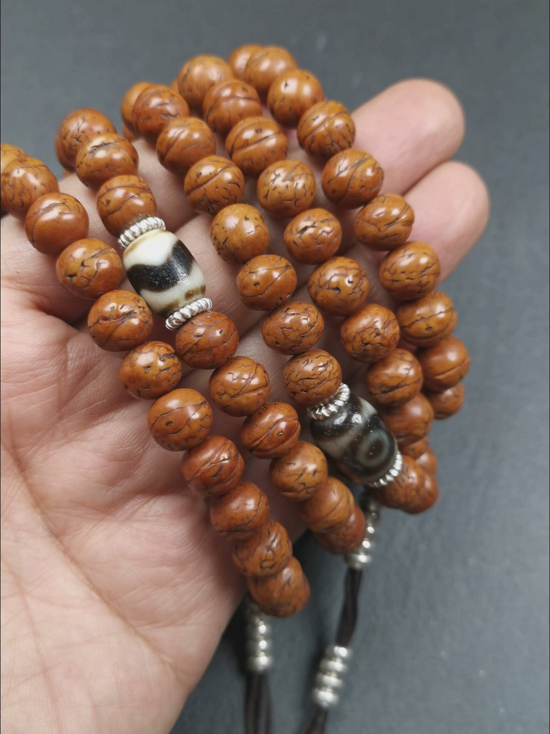 It is composed of 108 bodhi seed beads, and is equipped with 3 dzi beads, silver spacer beads, bead counters and maini jewel clip,and finally consists a lucky knot bead on the end, very elegant.