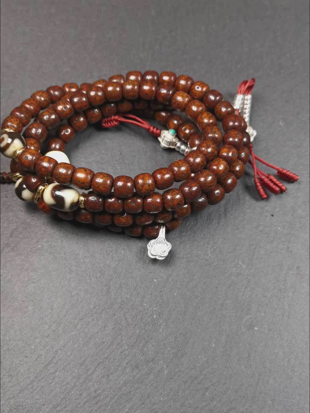 It's composed of 108 lotus seed beads,then add some dzi beads,1 pair of silver bead counters,and ivory guru bead on it.