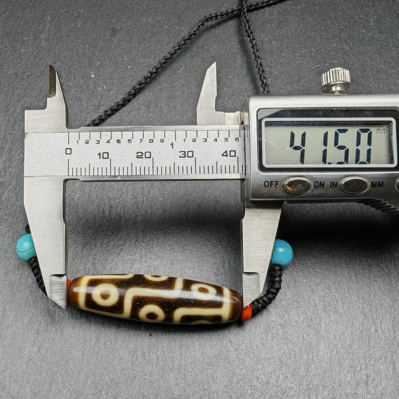 This 9 eyes dzi bead measures about 41mm x 11 mm.