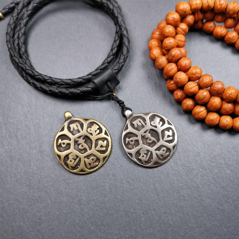 It is made of brass, 1.26 inches,carved with mantra of chenrezig OM MANI PADME HUM.