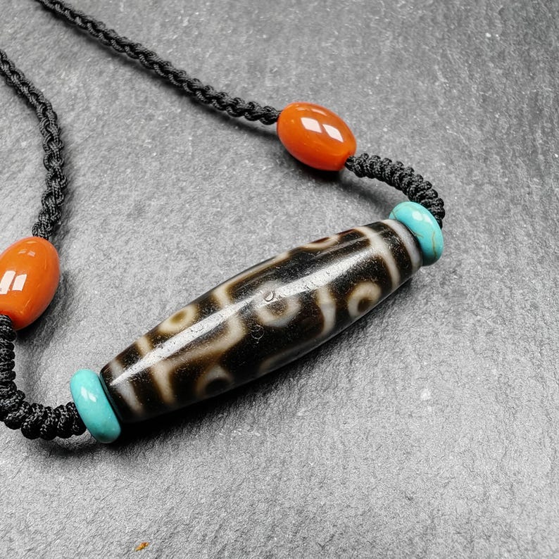 The necklace was hand-woven by Tibetans from Baiyu County, the main bead is a brown color 9 eyes dzi, paired with 2 turquoise beads and 2 red agate beads.