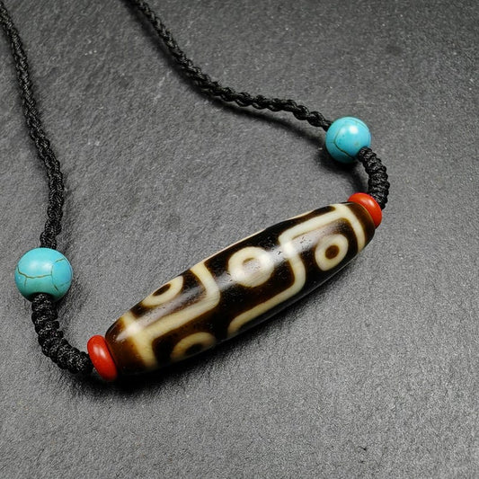 Tibetan Dzi Necklace,9 Eyes Dzi + 2 Wave Darlo Dzi Beads Amulet