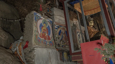 Statues and murals of Padmasambhava inside the cave where he practiced meditation.