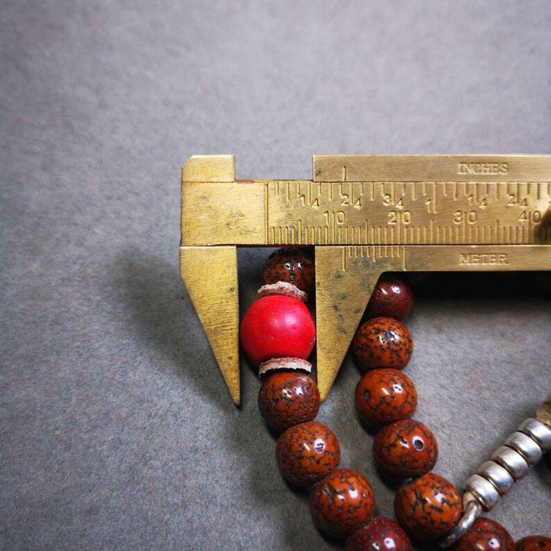 Its circumference is 90cm / 35.4 inches, 108 beads diameter of 9mm,comes with 3 spacer beads (Old Sherpa Agate),1pair of silver mala counters,and a thokchag vajra pendant at the end of it.