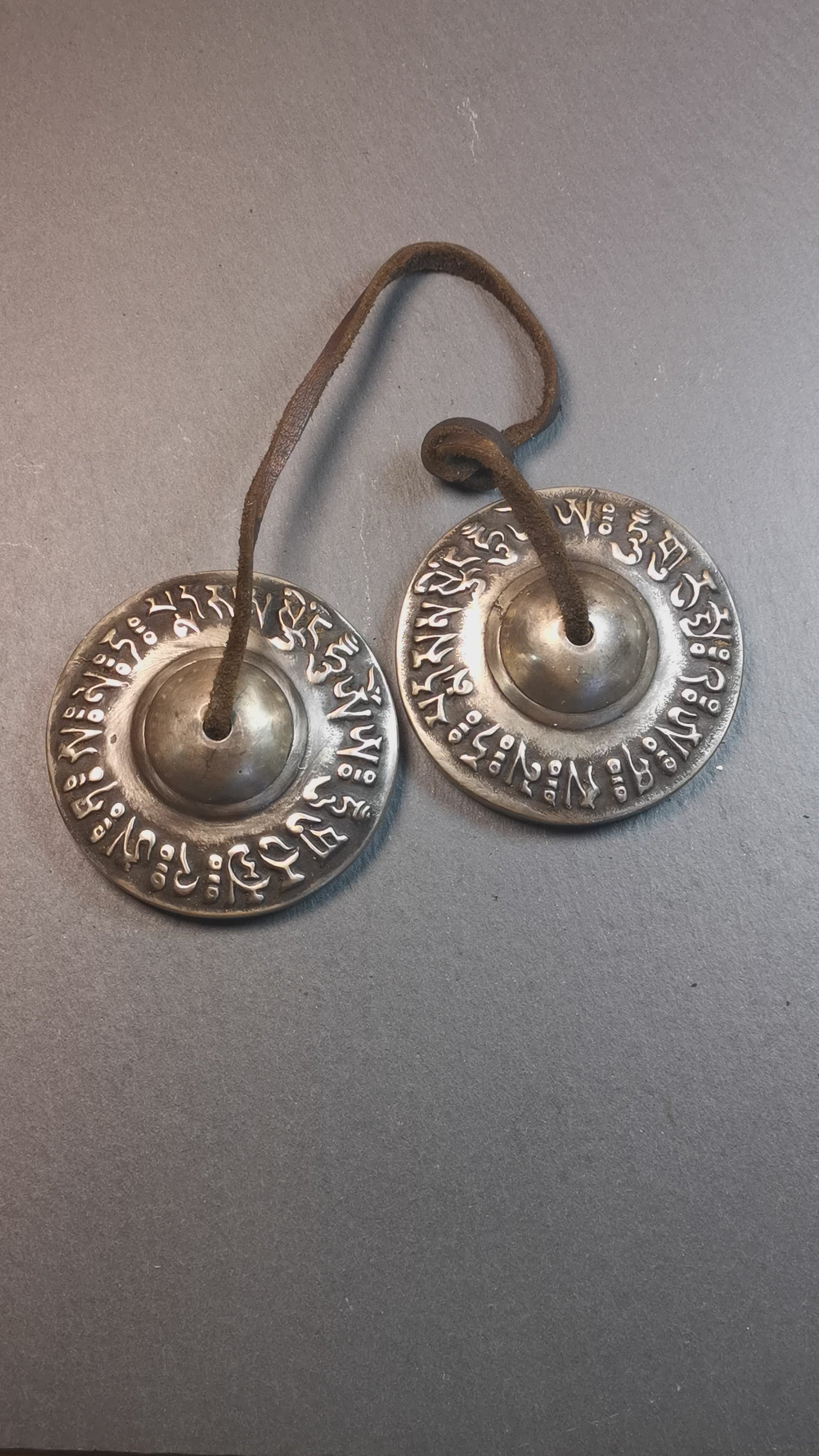 Two cymbals are joined together by a leather strap or chain. The cymbals are struck together producing a clear and high pitched tone. Typical sizes range from 2.5–4 inches in diameter. Tingsha are very thick and produce a unique long ringing tone.