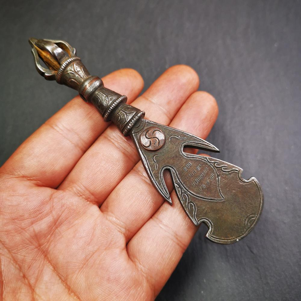 Its upper part is a half vajra, and the lower part is a kartika, made of cold iron,copper wire inlaid, carved with cloud pattern,very delicate.