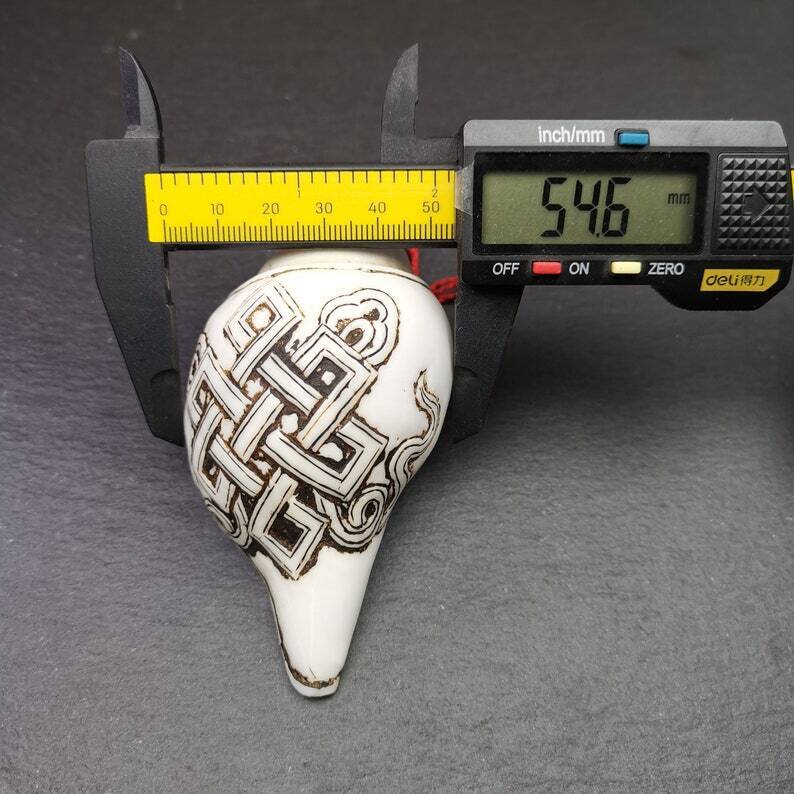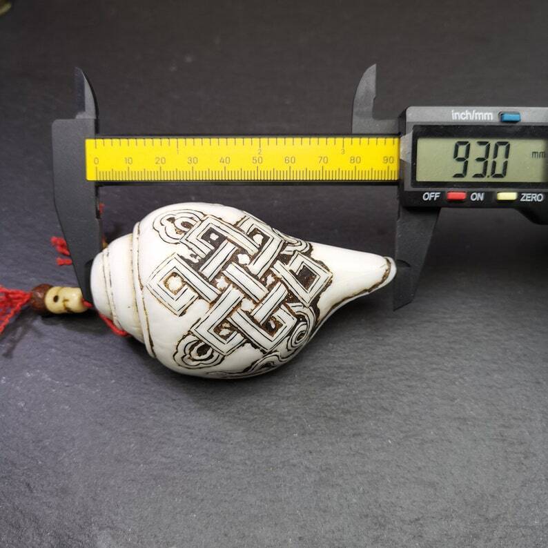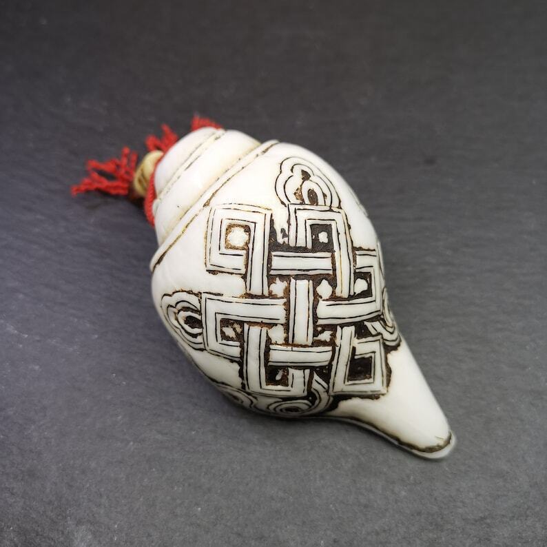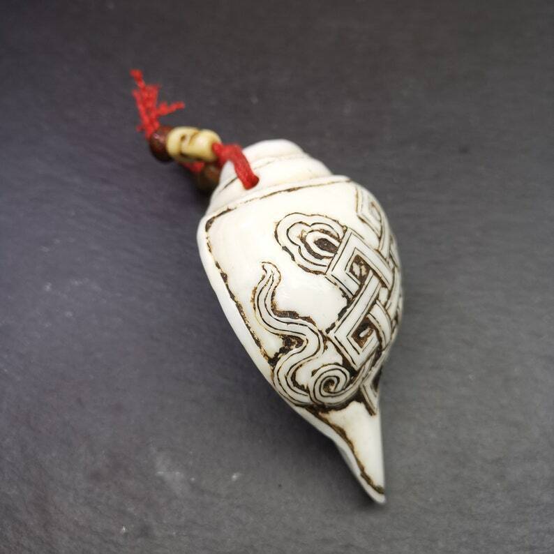 It's made of conch, entirely hand-carved with tibetan Endless Knot symbol.