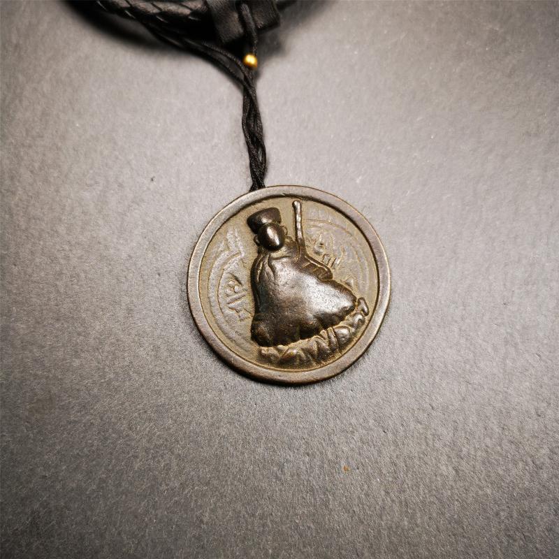 It's a badge or pendant,made of thokcha, 1.4 inch diameter,guru rinpoche on the front and his mantra on the back.