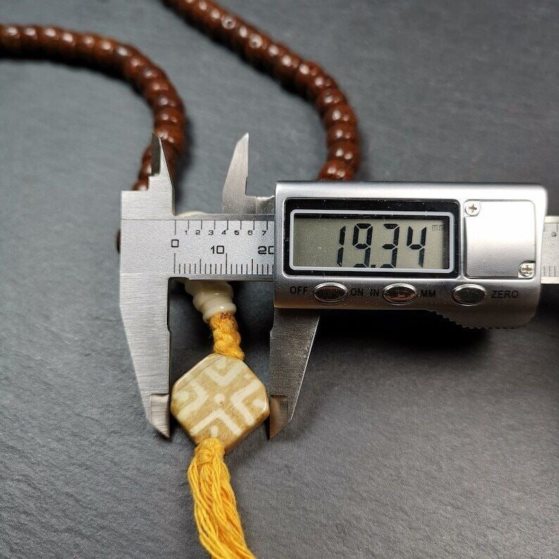 It is composed of 108 bodhi seed beads, bevel cut shape,brown color,with 1 agate and 2 turquoise spacer beads, white guru bead and pumtek bead pendant.