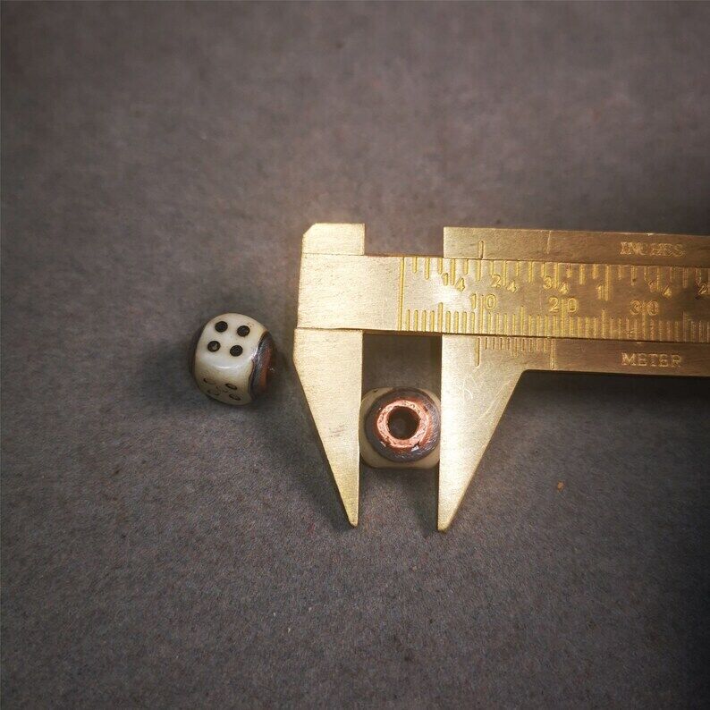 It is made of yak bone, inlaid copper and iron,size is 0.43" × 0.4".