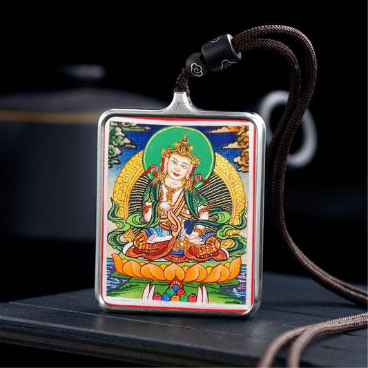 Handpainted Locket Thangka Amulet,Green Tara,Jetsun Dolma,Buddha of Wealth